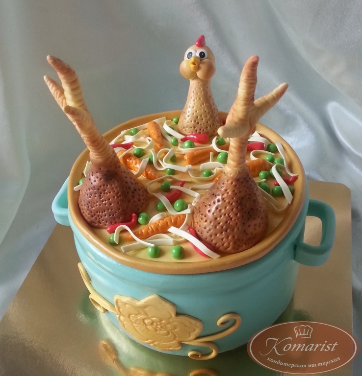 Необычный торт в виде кастрюли с бульоном, украшен головой и лапками курицы.